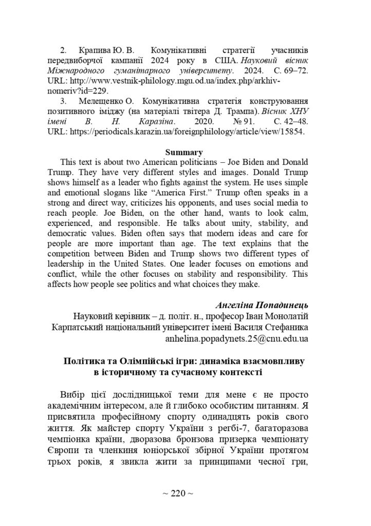 Здобувачка вищої освіти спеціальності “Політологія” (ОР “Бакалавр”, ОП “Політичні комунікації та публічна політика”) майстер спорту України Ангеліна Попадинець виступила з доповіддю “Політика та Олімпійські ігри: динаміка взаємовпливу в історичному та сучасному контексті” на Міжнародній науково-практичній конференції студентів та молодих вчених, яка відбулася 3 грудня 2025 р. у Чернівецькому національному університеті імені Юрія Федьковича. Вітаємо нашу студентку та її наукового керівника проф. Івана Монолатія з новим досягненням!